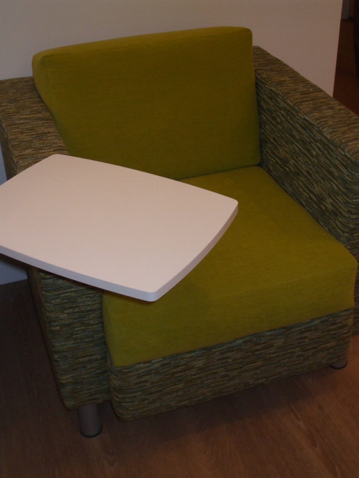 Add in some comfy chairs (complete with cool swivel tabletops attached to the arm of the chair, perfect for holding your laptop), a sleek bar top and stools at the kitchenette, and beautiful light fixtures throughout make this space a winner in my books!