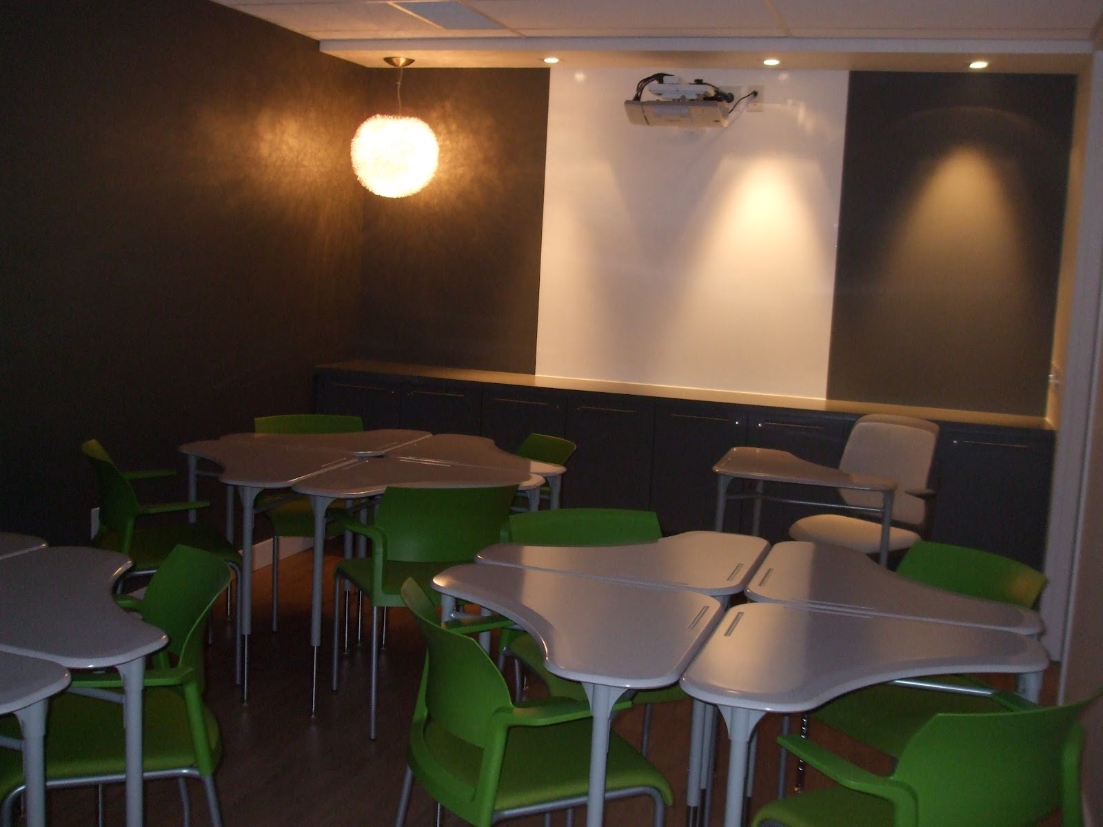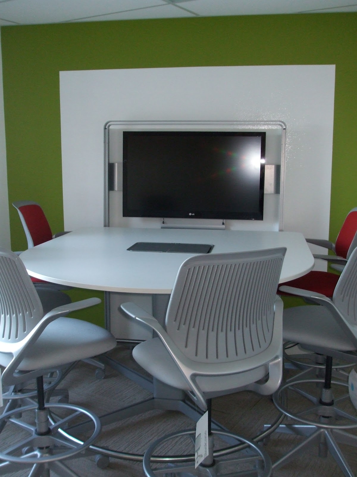 The office furniture is very functional, but does not lack style. Quite the opposite, in fact. Green and white chairs, desks that mix and match to form various configurations and chic metal privacy screens all hold the great design.