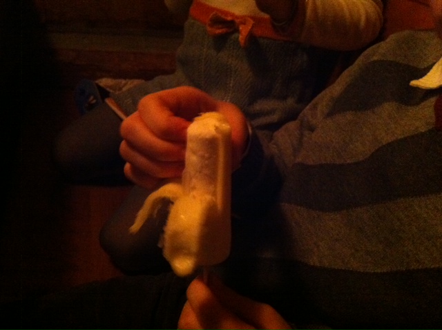 To top off the evening, they each had a really cool “peel-able banana flavoured frozen treat” for dessert that is something you just have to see. No artificial colours either which we were pleased to hear.