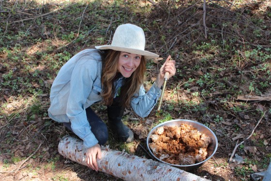Step 3. Inoculation Time! Use the drill bit size recommended for your inoculation tool. I went ahead and ordered a bit from my spawn supplier because it had a built in depth stop. This made inoculating our 50 logs much more efficient. For a few home logs, you could spare yourself the added expense and just use any drill bit of the correct diameter. You need to drill holes 1 1/8” deep, 4-6” apart in a staggered diamond pattern of rows 2-3” apart. You don’t have to make your way around the entire log. We aimed for around 5 rows. Don’t wait to fill holes. You don’t want the wood drying out. Plug holes with spawn using inoculating tool, or some improvised ramming tool. Once filled, the holes need to be capped with cheese wax. Have this melted and ready. We just painted it on with a small, cheap paintbrush.
