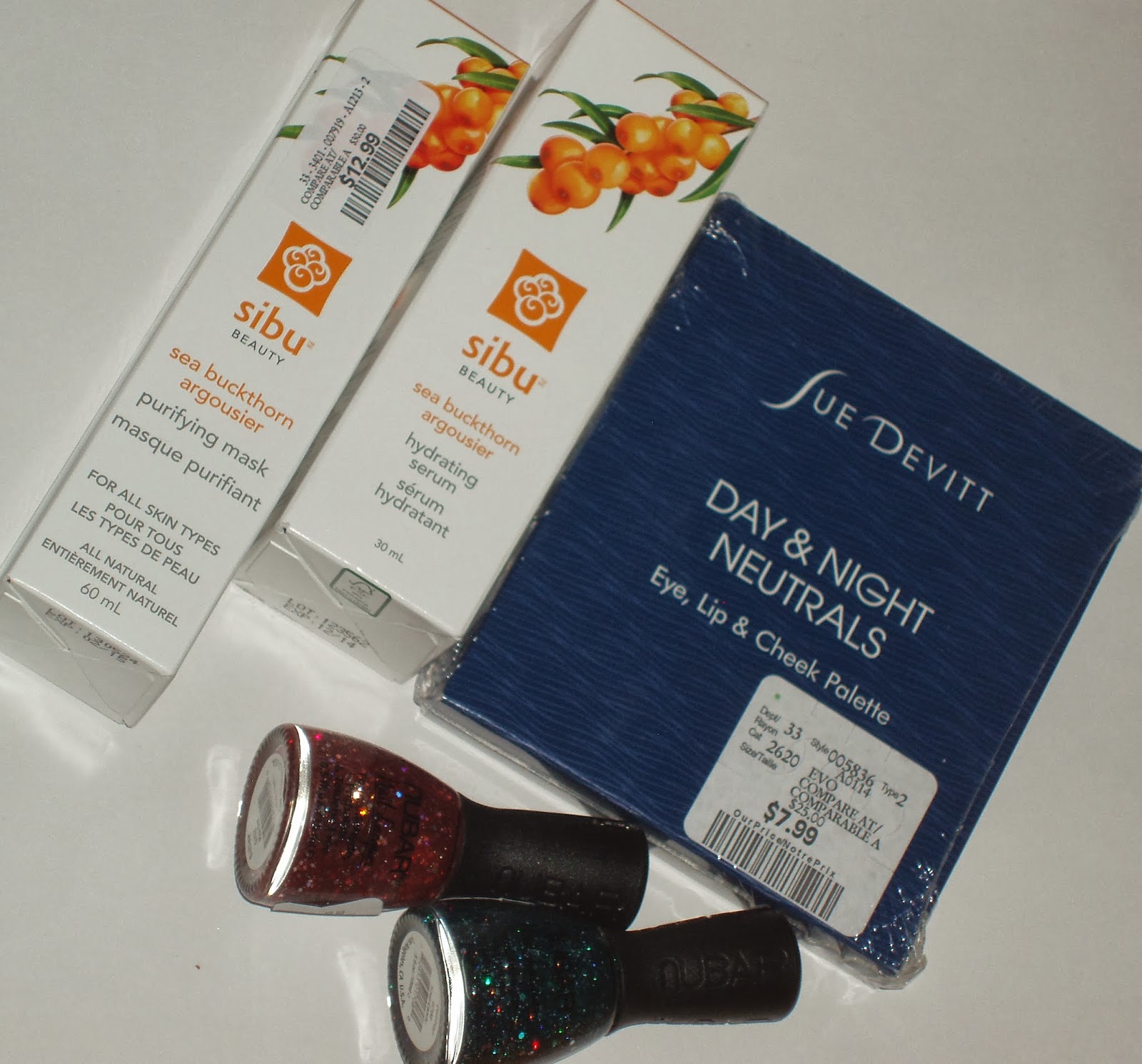 I got a Sibu purifying mask ($12.99, comparable at $30) and hydrating serum ($12.99, comparable at $40), Sue Devitt Day & Night Neutrals eye, lip & cheek palette ($7.99, comparable at $25) and Nubar nail polish in Pink Dot and Sour Candy, $5.99 each, comparable at $8.