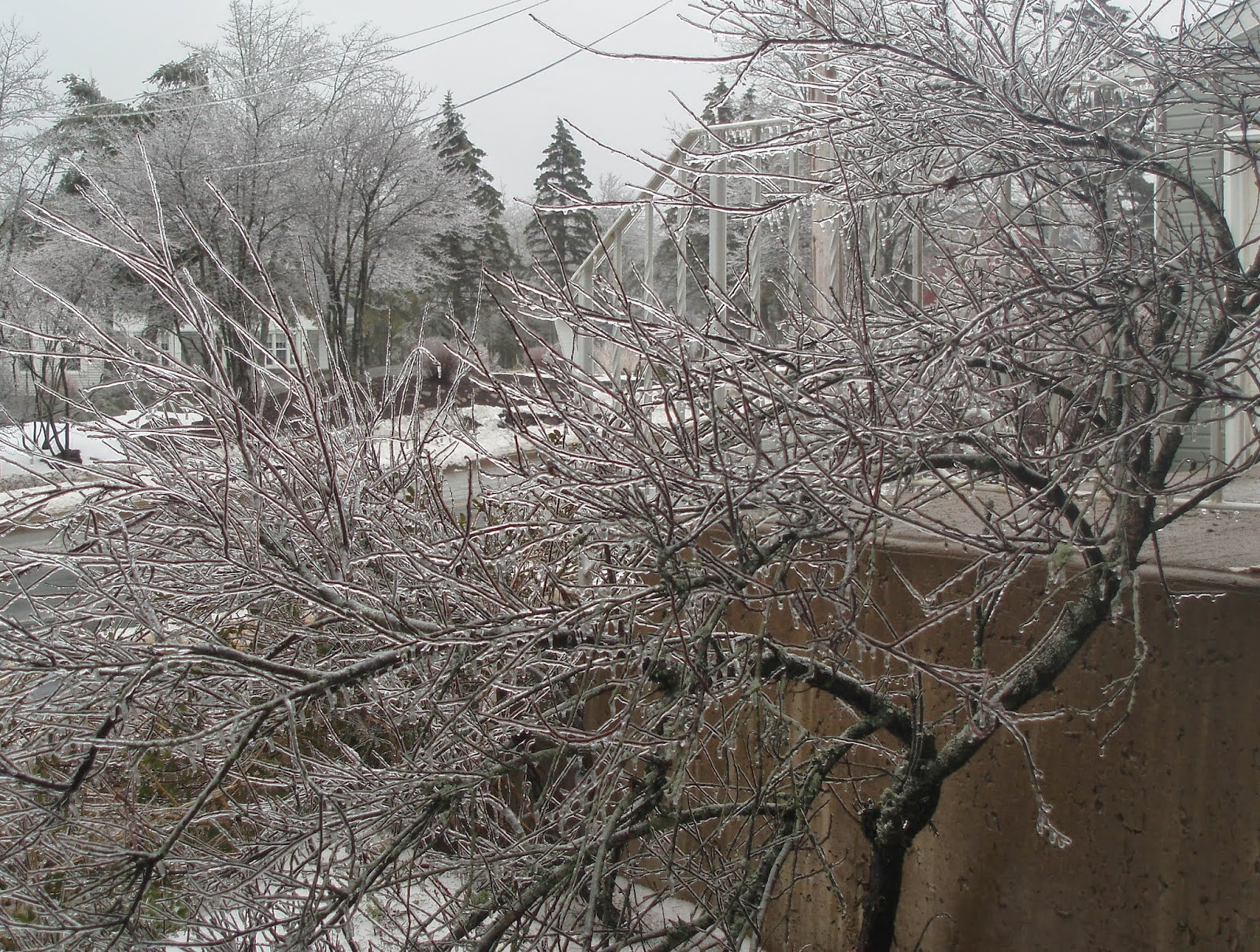 This was how the little tree in my front lawn looked yesterday. Hard to see (look closely or enlarge the pic) but every single branch was wrapped with ice. Oh April, what happened to you?