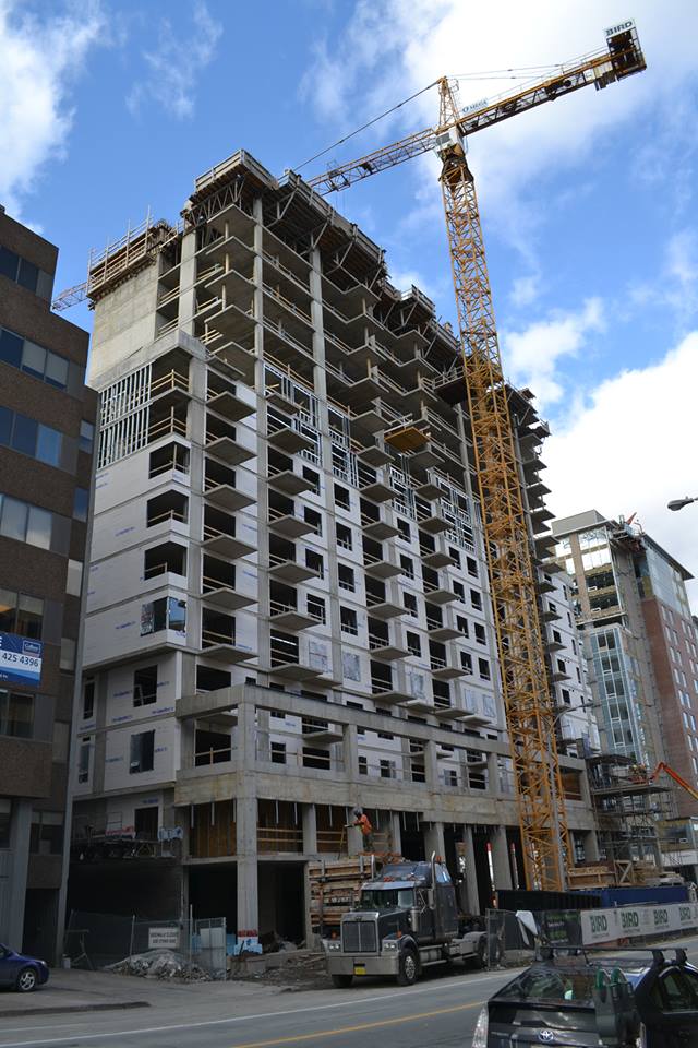 Here is an updated photo of the 17 story residential building on the Citadel Hotel redevelopment site. The construction is on its 16th floor so within a few weeks it should be topped out. The three buildings that are part of this development have completely changed this side of Brunswick St. and will have an great impact on pedestrian traffic in this area once it's completed.