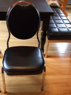 I have an old harvest table that I got in a swap with a friend (she wanted a smaller table, I wanted a bigger one). I painted it black, fixed the drawer and added new hardware. For seating on one side of the table, I used a large vintage bench, complete with the original tufted leather and chrome frame/ legs. I got this gem for free when I rescued it from the junk pile that was being thrown out by a previous employer who was cleaning house to gain more storage. All I had to do was scrub off 30 years of dirt and dust. I love both of these pieces because they are originals and because they come together to make an interesting and eclectic look.