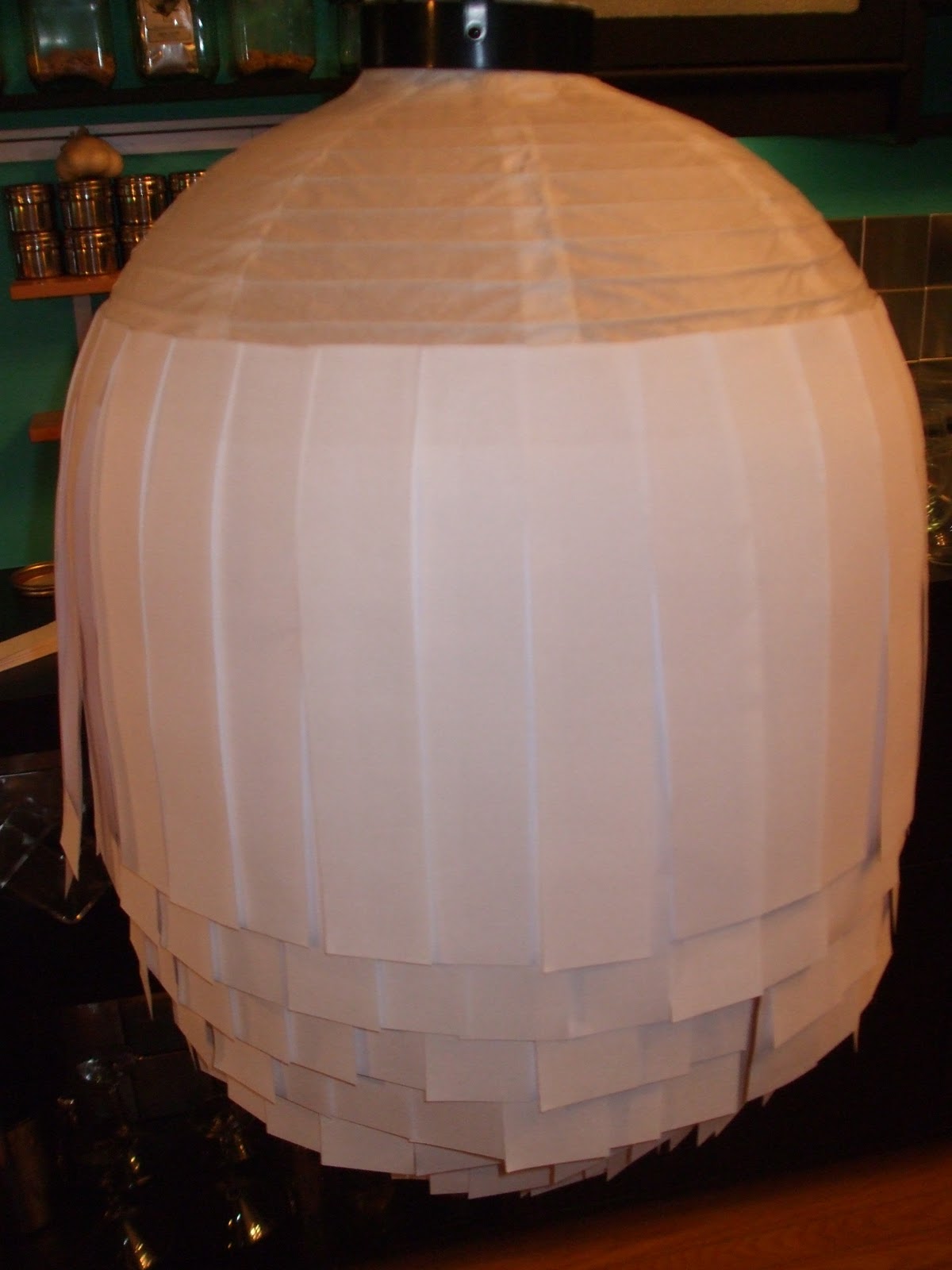 Shortly after my friend shared this gem of a DIY project, I saw something very similar on a home décor show….they started with a huge paper shade and glued cone-shaped coffee filters all the way around instead of paper strips. The finished product looked fabulous!