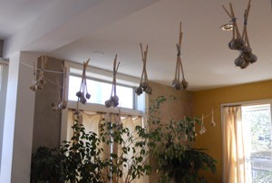 Curing garlic is great for long term storage of garlic if you don’t want to use it right away. Cutting the stems are optional. Some people like to keep the leafy bits to braid their garlic once they are cured. If you cut the stems, leave about 3-4”. It should take approximately 4-6 weeks for garlic to dry. How do you know when their ready for storage? Cut approximately 1-2” inch above the bulb. If it’s moist it needs more time to dry.