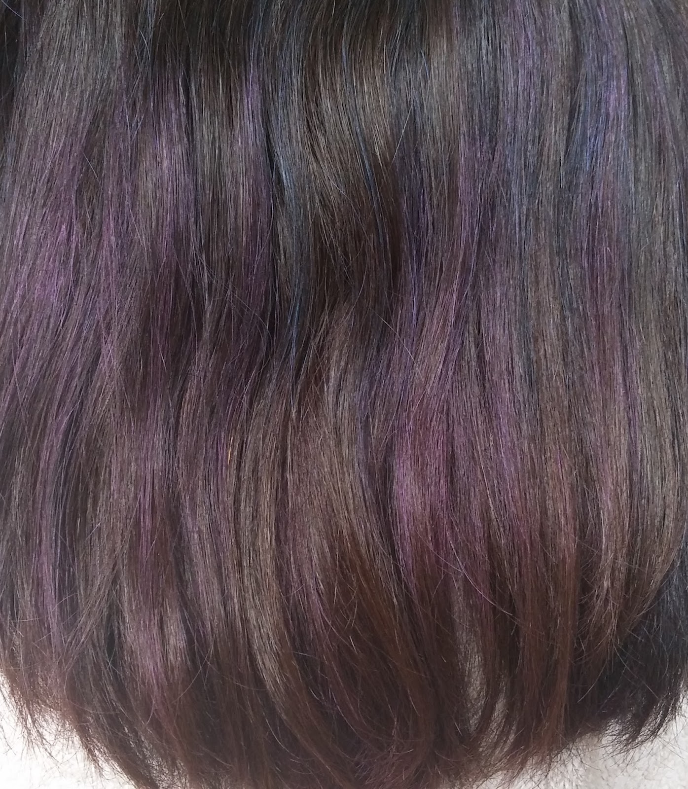 All in all, if you have dark hair, expect an iridescent, fairy effect rather than intense colours as mentioned on the packaging. Also note that the colours are more visible in sun light and very subtle indoor. They do take a few hours to be completely dry (the hair feels a bit stiffer) or would come off on your hand if you touch your hair before that. No noticeable transfer on the clothes though.