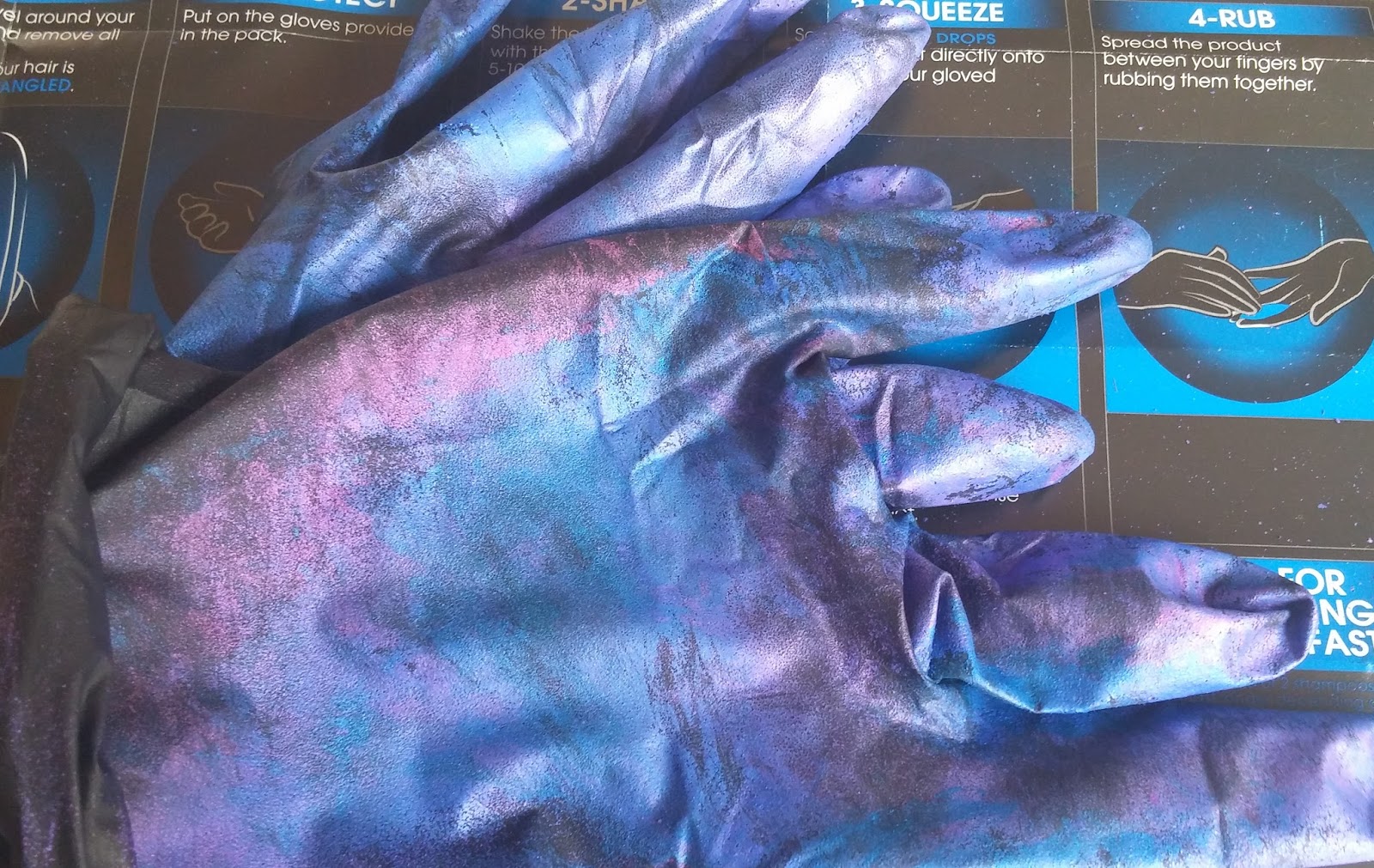 Left: the content inside – a bottle of colour, a pair of reusable gloves and an instruction leaflet. Right: the “galaxy” of colours left on the gloves after we used both colours.