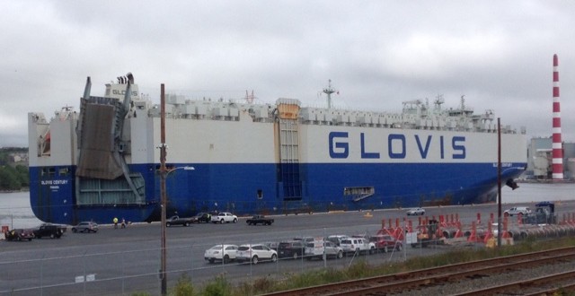 In what I believe is a first, a Pure Car/Truck Carrier has tied up at pier 9. The Glovis Century arrived, rotated 180 degrees and tied up. She is likely unloading project cargo or heavy equipment.