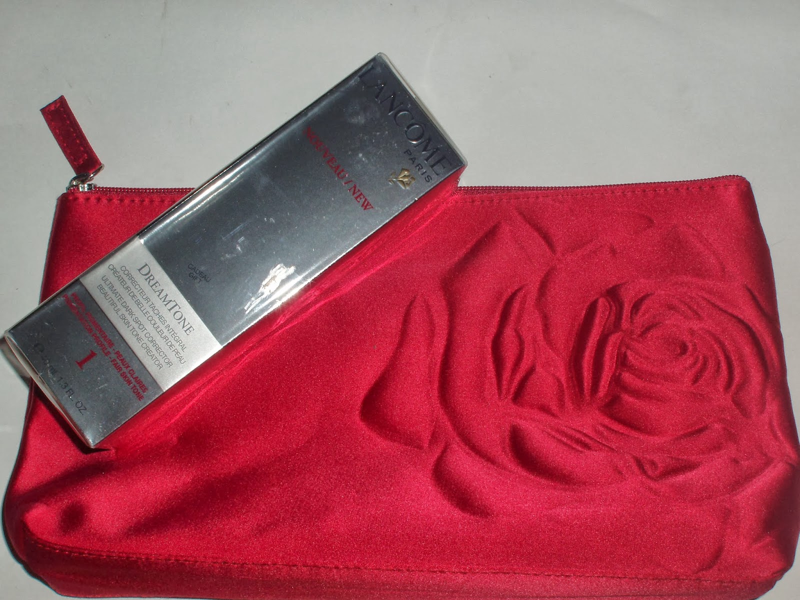 This is the red cosmetic bag with it, very luxurious looking with the embossed rose pattern. You can choose the dark blue if red is not your colour.