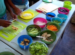Some of the many ingredients brought to the table: carrots, cucumber, radish, shredded beets, grilled chicken, mango chutney tofu, lettuce, purple cabbage, red and green peppers and rice noodles.