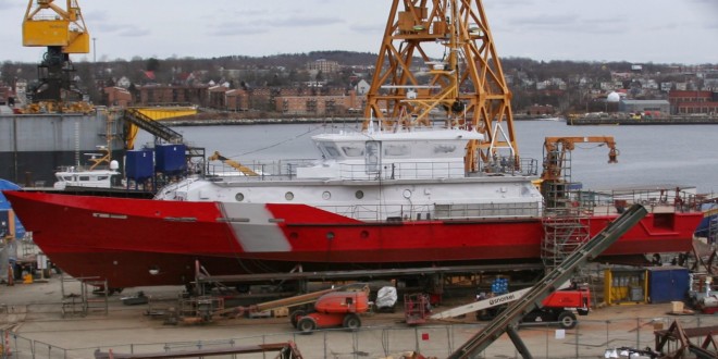 The CCGS Captain Goddard M.S.M was rolled out on Monday, after the launching of the CCGS M. Charles Saturday night. With the rollout having occurred, demolition of the remainder of the building can continue, and was quickly resumed this past week. Unlike the previous vessels, she was painted while still in the shop, though is missing her white stripe, name and coast guard markings.