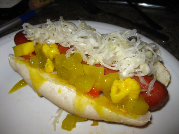 Hot dog dressed with Lunenburg sauerkraut, Fundy dulse, and home-made mustard pickles from the South Shore!