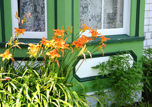 This is a very typical sight along the back roads and countryside of Nova Scotia. Charming old houses with banks of day lilies.