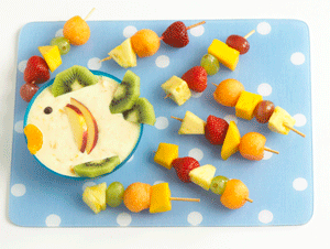 4. Serve with fruit skewers or pieces cut for dipping. We’ve also found it to be a nice alternative to ketchup when served with fish sticks as well.