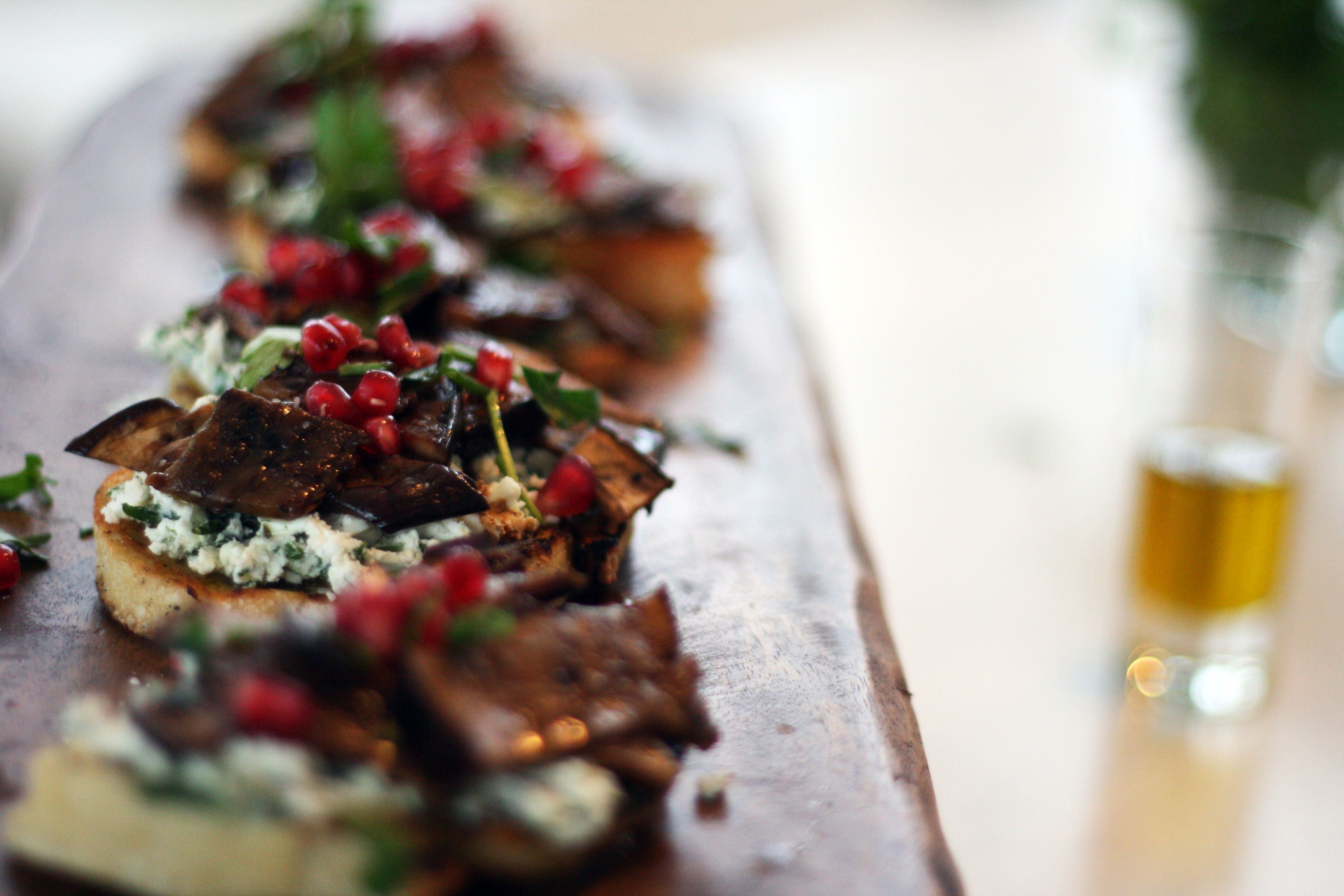 Grilled eggplant crostini with herbed goat cheese + pomegranates.
