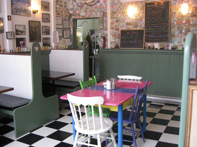 The restaurant itself is adorable; black and white checkered floors with a stand-out wooden multicoloured table in the center, surrounded by cozy booths.