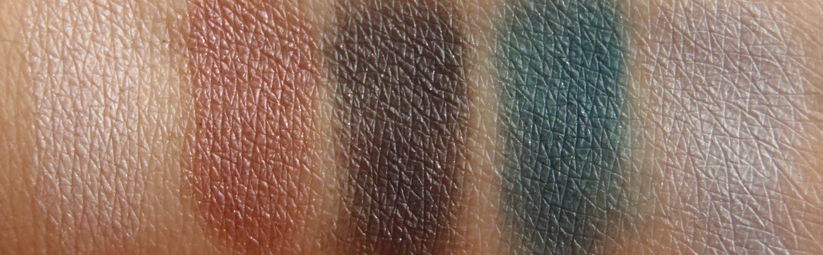 Row 1: I550 Olive Gray (not a hint of grey that I notice), I524 Pinky Beige, I916 Frosted Mauve (lovely lilac tint), D236 Lagoon Blue (green shimmers on sheer base, meant to be layered) and S102 Onyx. (could be more intense but builds up well).
