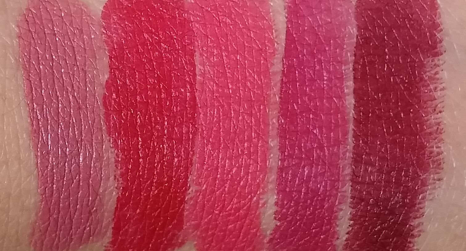 Swatches below were done with just one swipe each. Infamous, described as a soft peony is the most easy-to-wear non-nude shade, I can wear it everyday. Dashing, a cherry red, and its darker partner Blow (dark berry velvet, far right) are in the opposite colour spectrum and glam up your night looks in an instant.