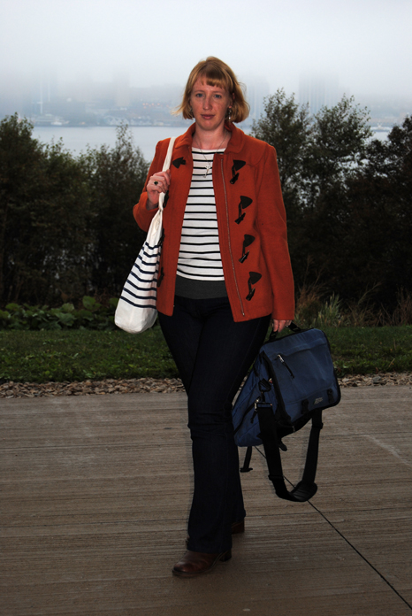 L-A: Today’s photo was taken in a very public place – the NSCC Waterfront campus – so that should get me a few points for humilation. However, I fell short on matching today’s inpsiration: Serena Van der Woodsen. I know! That is unexpected inspiration, especially since Gaga wears pants more often than Serena. But I’m talking about pilot episode Serena. Fully clothed, no sequins in sight Serena.