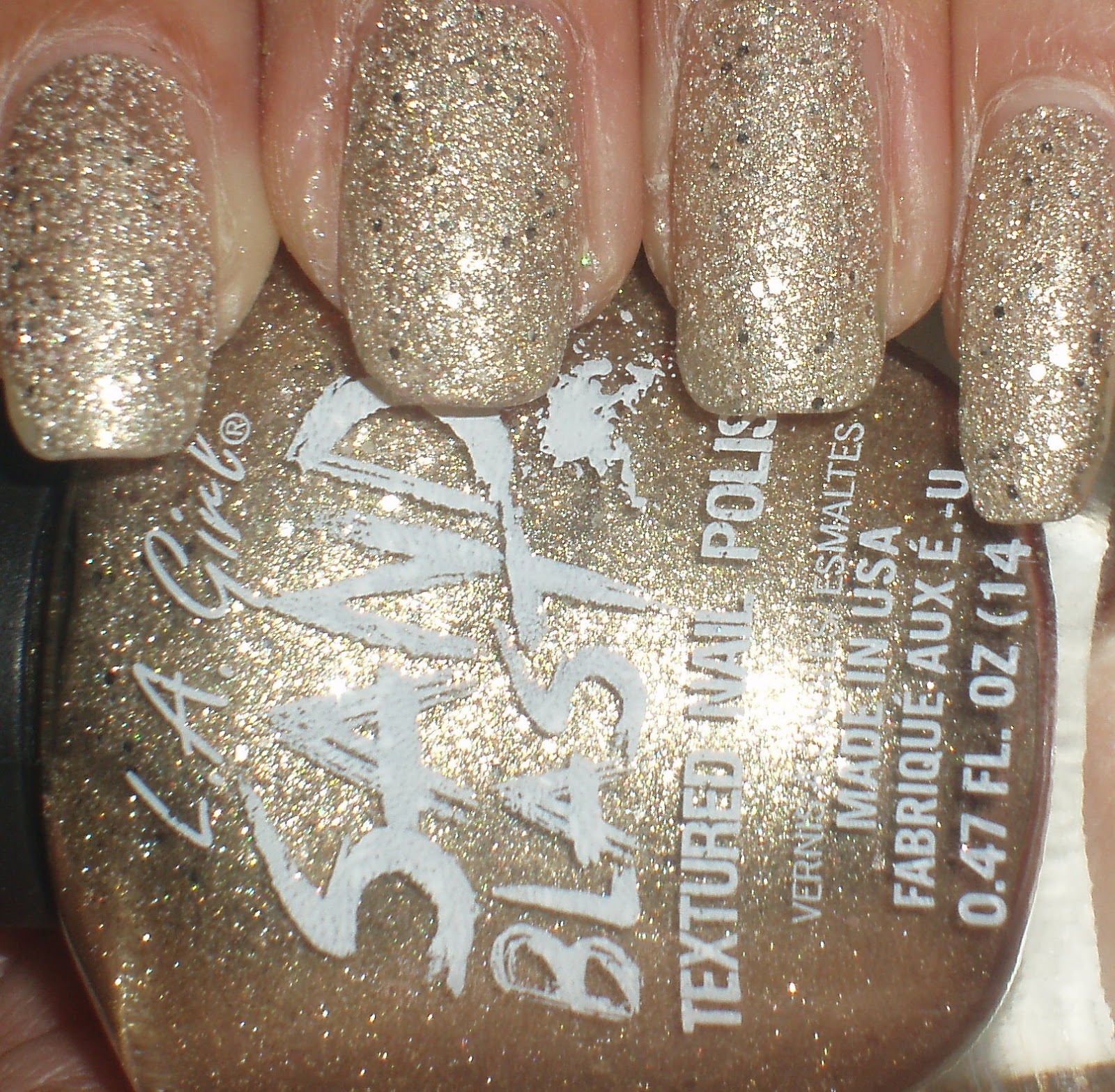 LA Girl Sand Blasts offer the glittery type of textured polish with chunkier glitter pieces like OPI Liquid Sands and more than Jesse’s Girl Julie G). And they don’t feel extremely sandy. I have absolutely no problem with this 🙂