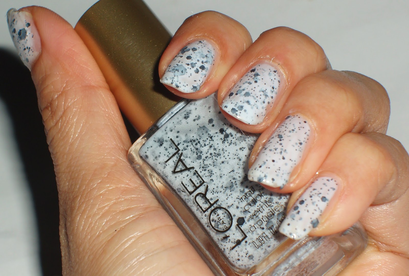 This is L’Oreal Spot Me, with pale/ baby blue base and multiple-sized black hexa glitters. If the base were offwhite, I’d say it is the cookies and cream in nail polish version. Pale blue is close enough though 🙂
