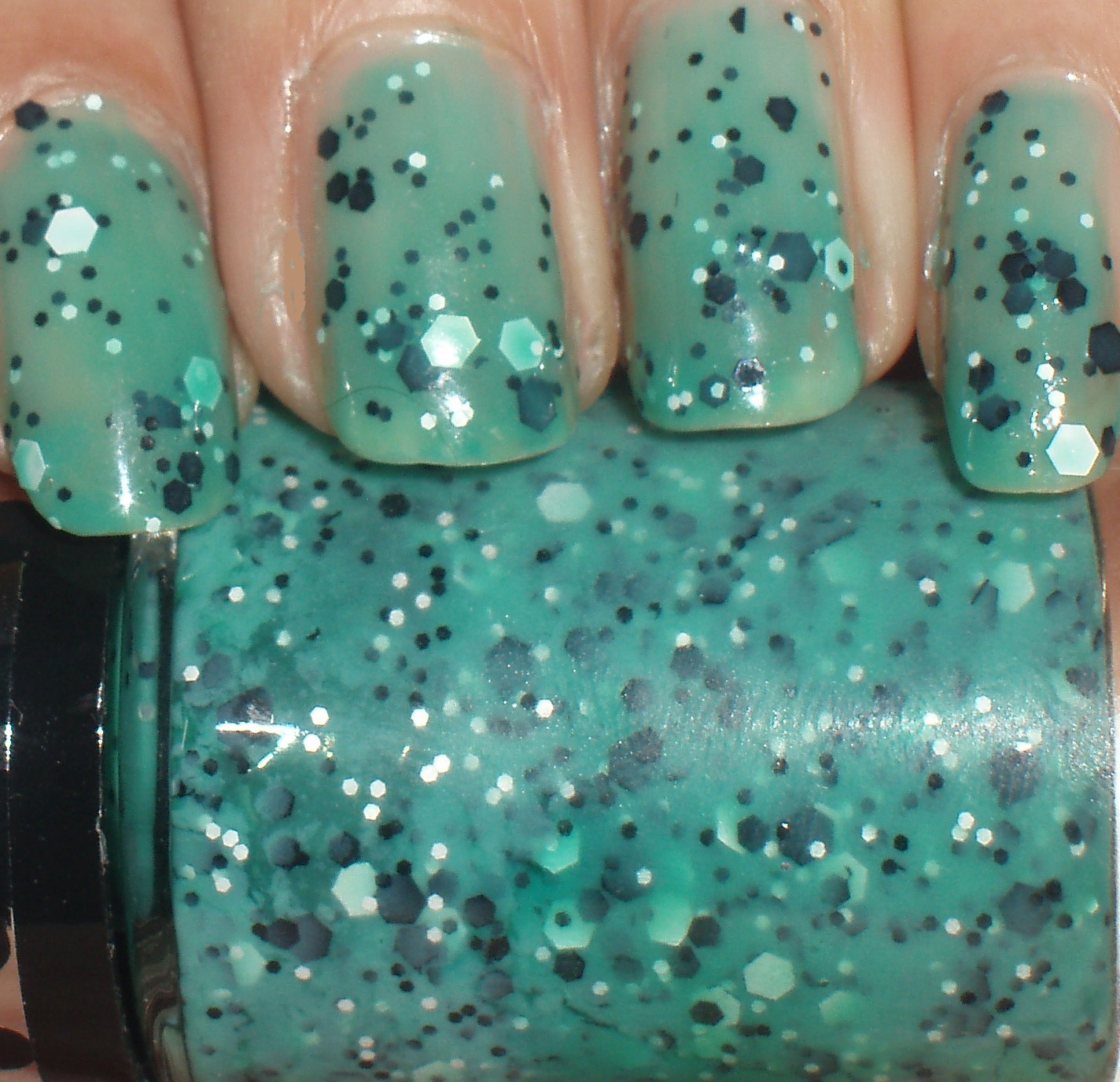 That aqua/ teal base sure grabs attention, and the multi shapes and sizes of the glitters do not do a bad job either. I got lots of compliments wearing this, some thought I had my nails done at a salon
