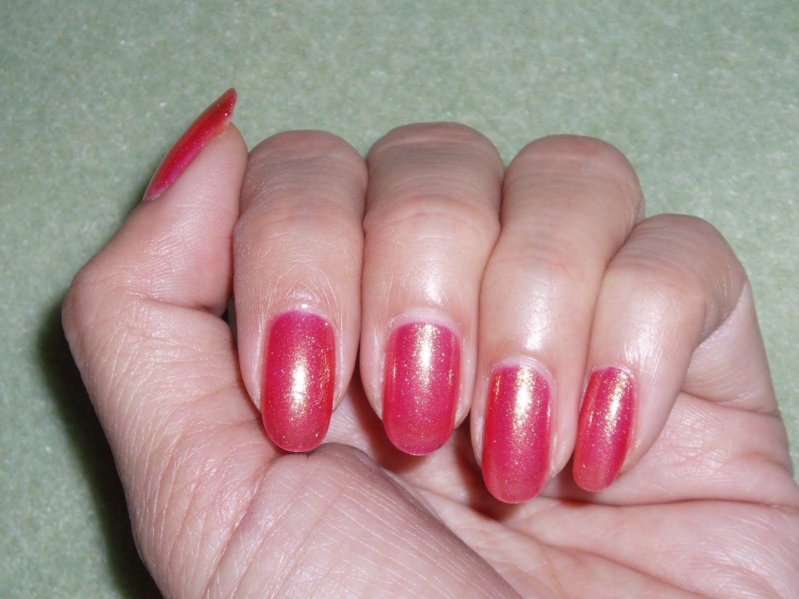 I picked this beautiful shimmery orange shade – DS Treasure. Yes, it looked orange in the bottle but the pink base took over the nails, only a tiny shine of orange on top – it didn’t even show up with the flash, did it? Plus it was sheer, 3 coats and still VNL.