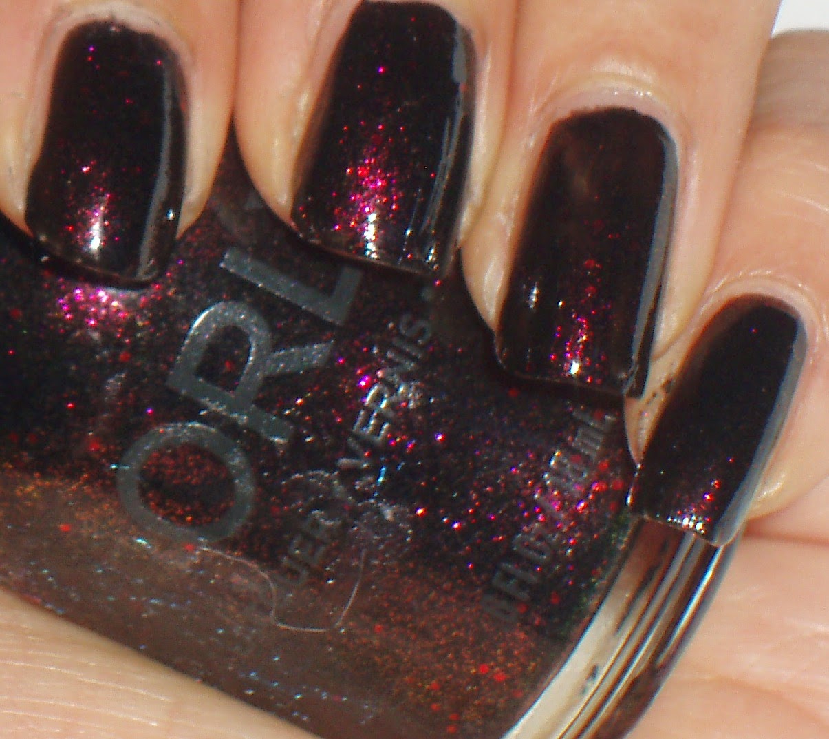 Darkest Shadow is described as a black with lots of red and fuchsia shimmers. The shimmers are so strong and shine through that dark base that I sometimes have a hard time calling it a black.