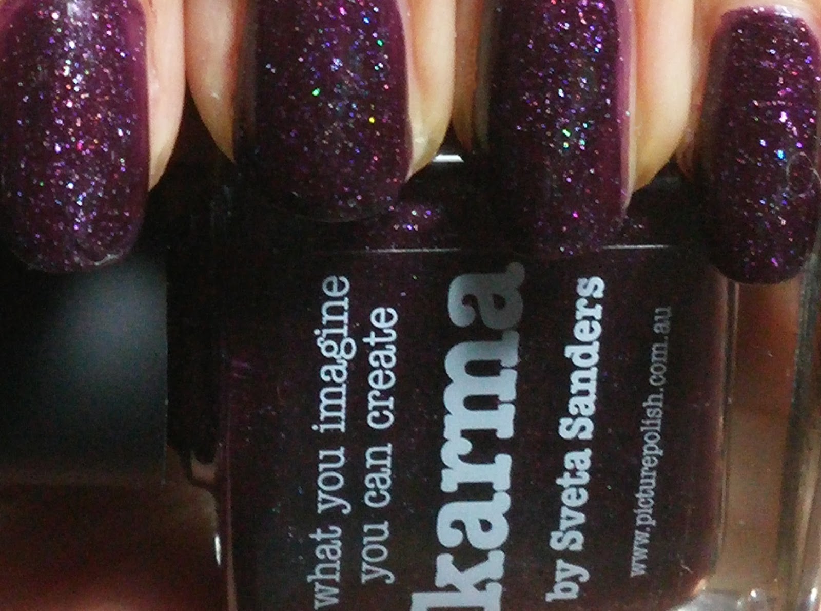 Described as a dark eggplant jelly with scattered holo flecks, Karma dries pretty smooth on the nails. First coat is a little patchy, 2 coats even things out and darken the base.