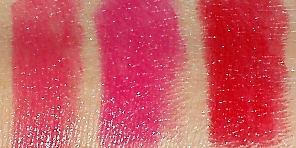 I bought 3 boldest ones – Pure Coral, Velvety Fuchsia and Red Suede (0.11oz/ 3.2g, CAD1.77 each or 2/CAD3). The other 2 were sold out at my location.