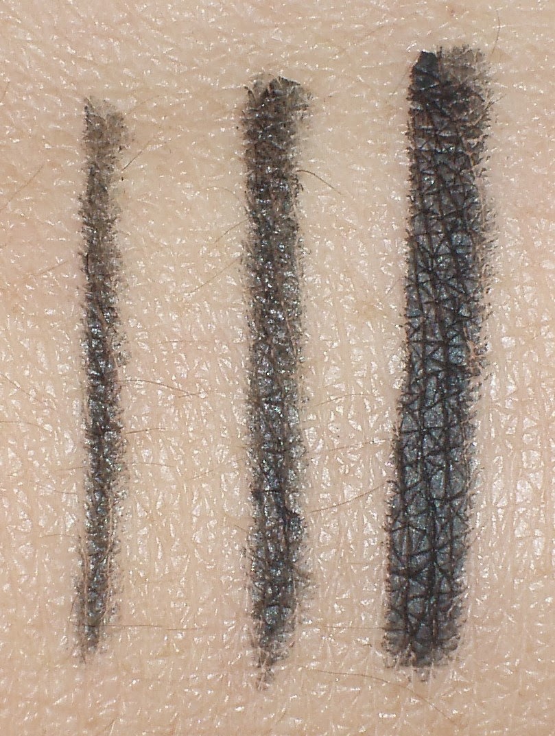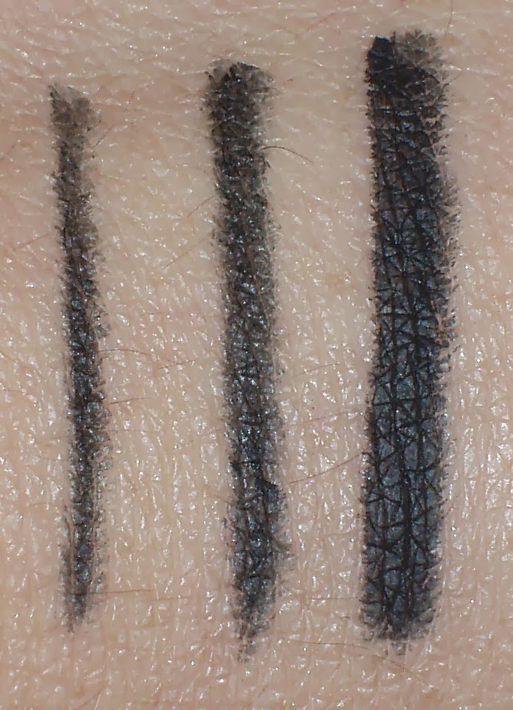The swatches: from the left, one swipe, then a few swipes to make the line thicker. On the far right is a comparison swatch of Milani Liquid Eye liquid-like eyeliner pencil in Black, one swipe.