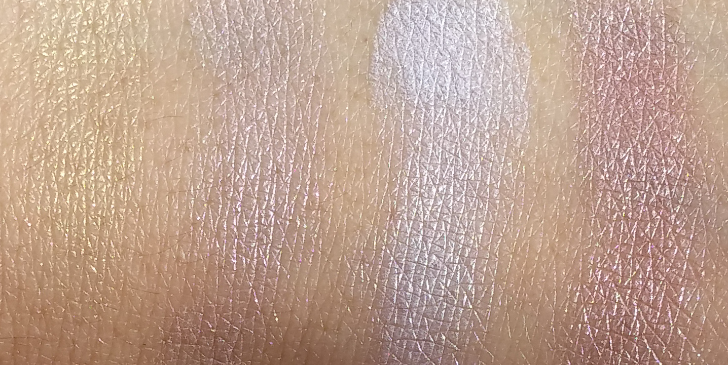 Swatch of the first row with my finger – a gold with gold pearl, a cool-toned light pink with shimmer, a lavender with shimmer and a golden pink with shimmer, as described by the brand.