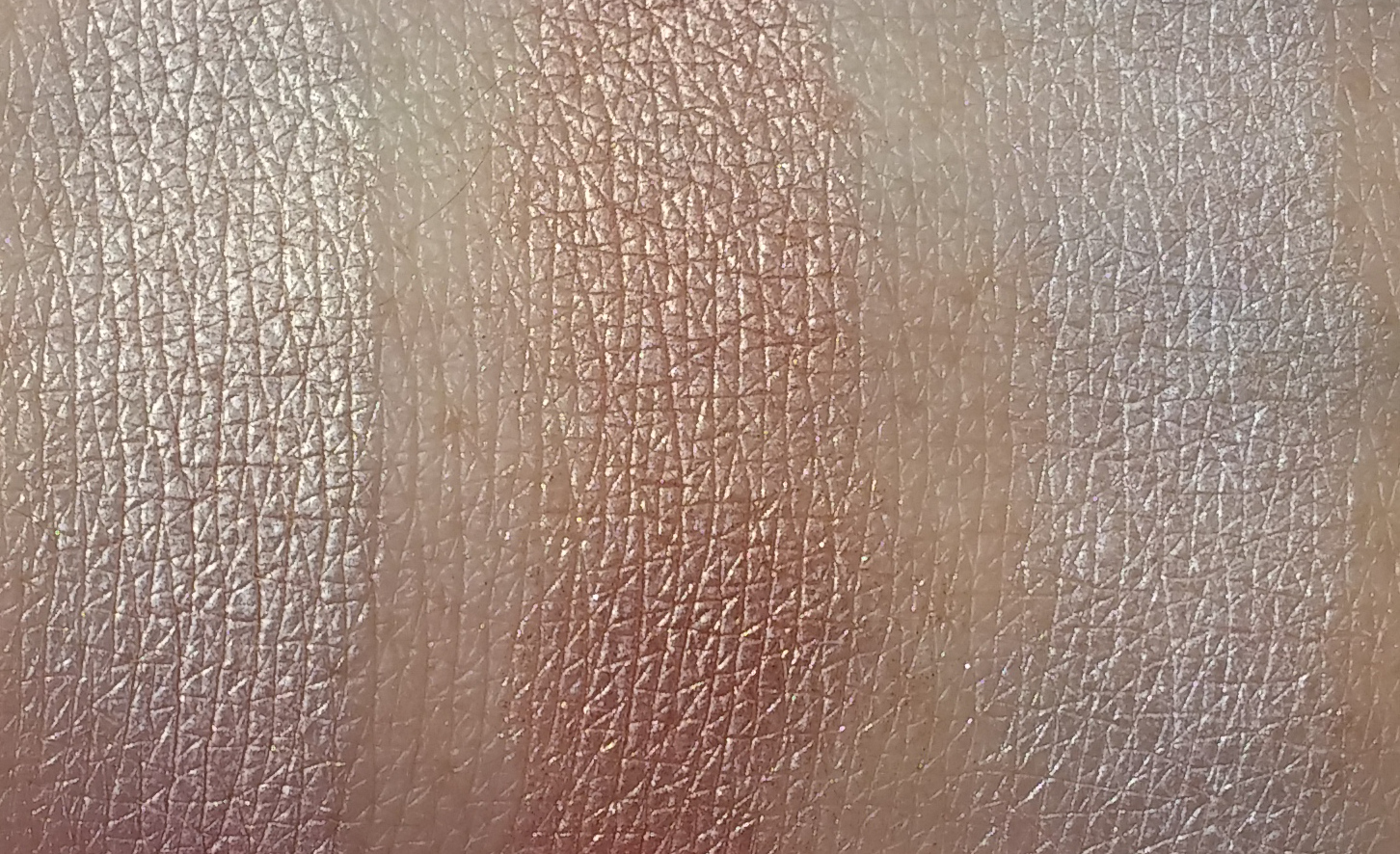 The second row has a light gold with peach undertone and shimmer, a bronze with gold pearl and a champagne with shimmer, which is great for the brow bone.