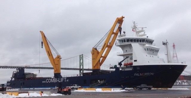 Combi-lifts ship Palmerton tied up at pier 9 Last Night. Part of Combi-Lift’s CL900 class each crane is rated to 450tons, or 900tons combined lifting power. She is also Ice Class E3. Built by the Kouan Shipyard in China she and her 6 classmates were built between 2009-2010 (She is First of Class)No word on what she’s offloading, though its likely some sort of project cargo.