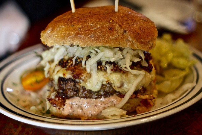“8oz Island beef brisket, house-made gouda and bacon fritter, house-made stout grainy mustard, Russian peppercorn dressing, and house-made sauerkraut on a toasted pilsner beer bun”