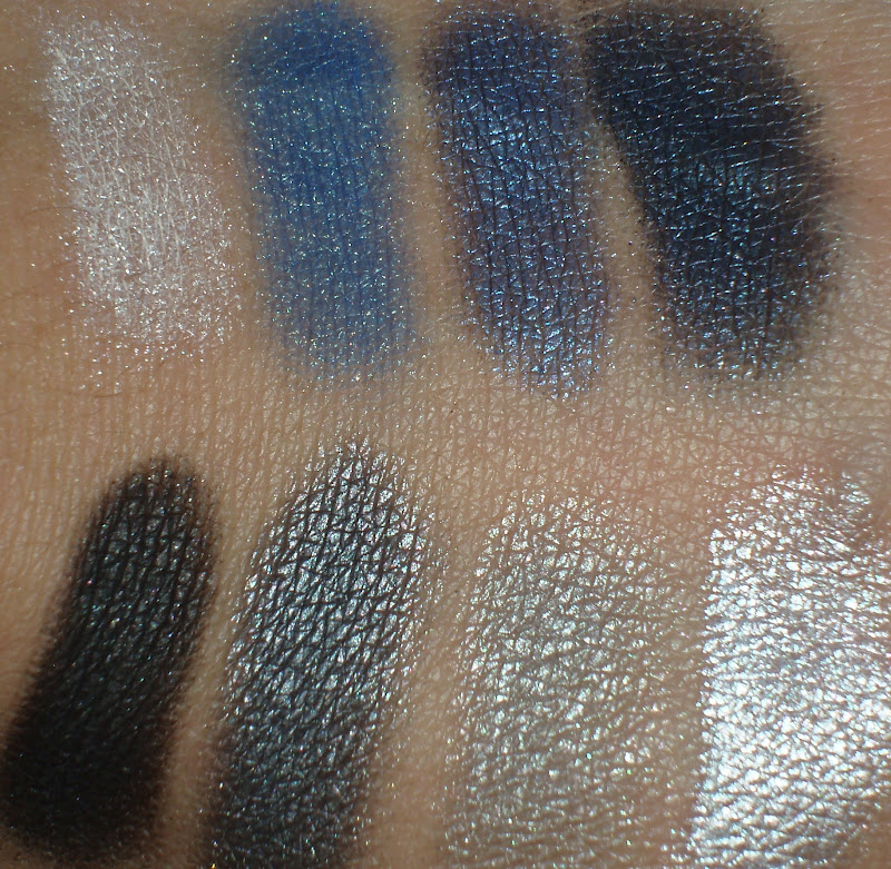 And the swatches with a damp brush, no base, first with flash. I told you the blues are intense and great for smoky eyes, didn’t I? The first navy is, again, darker IRL, the second shade has beautiful purple flash and the third one is close to black with blue flash.