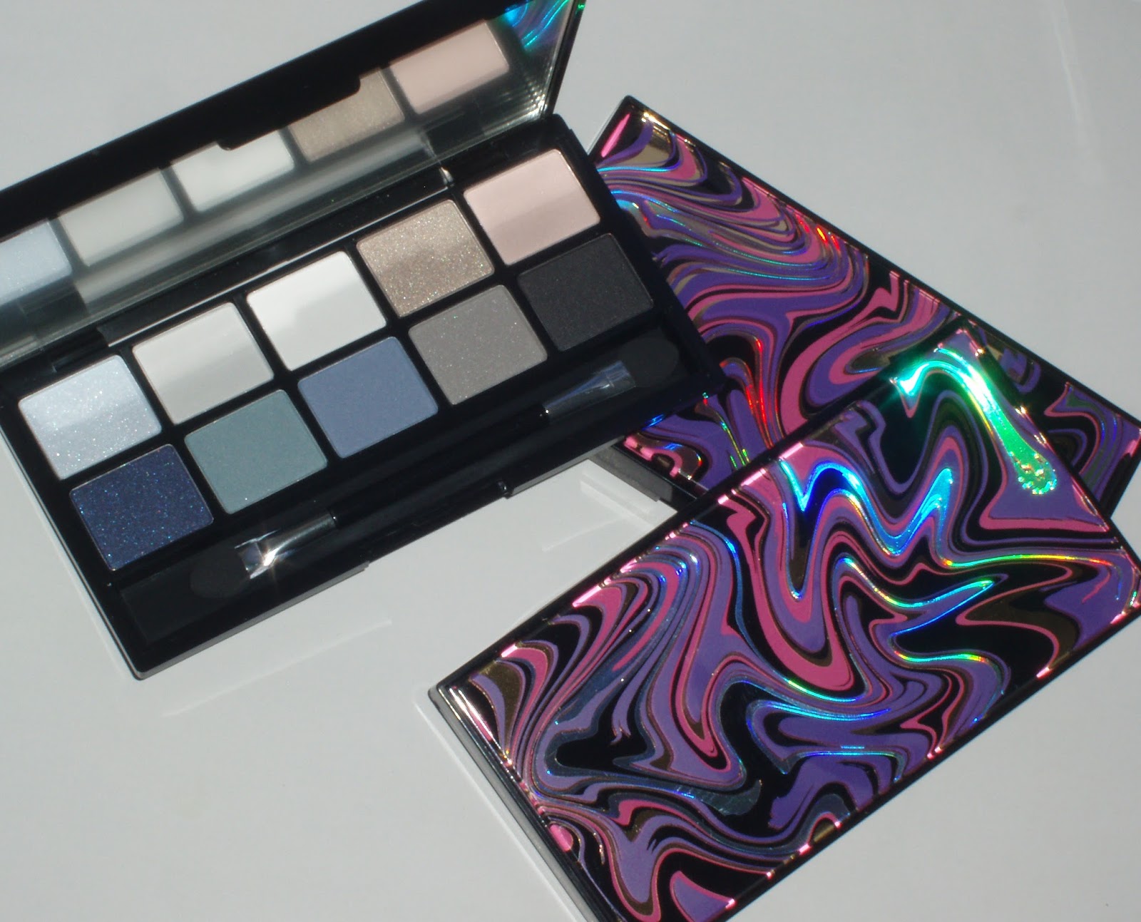 The black is a let down, pigmentation wise, unfortunately, but you can totally pull off a smoky eye with the dark navy in lower left corner. It has glitter particles that do not transfer much to the lids, and the colour is more intense on the eyes than shown here.