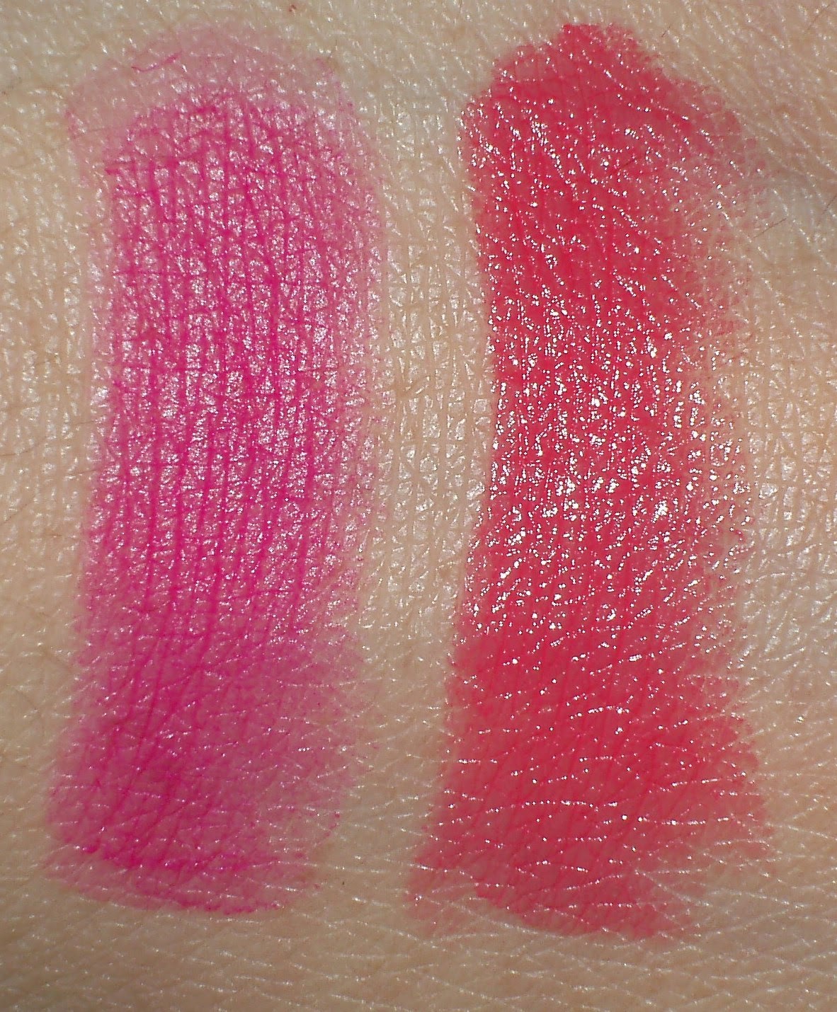 I picked the brightest shades of course. Separately, they both look red. Next to each other, Sultry Samba shows a lot more blue and a semi matte texture, while Snow Peach looks coral red and shiny.