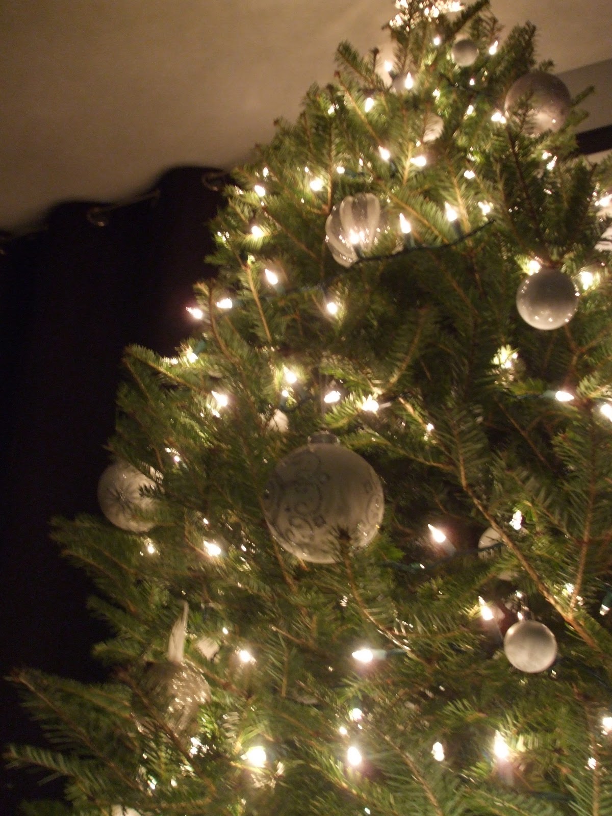 The tree is pulled together with a white and silvery tree skirt – rimmed with light grey fluffy faux fur! So awesome.