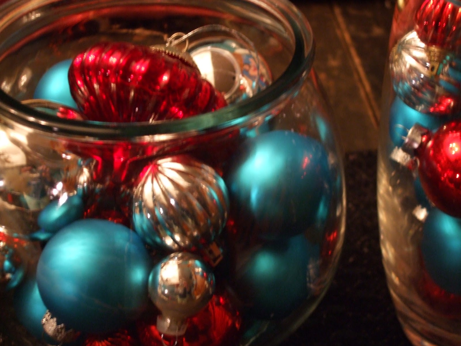 Much more colorful décor is in the kitchen/dining area. To fit with the existing décor, there are glass bowls filled with red and turquoise ornaments which serve as a centre piece on the dining table.