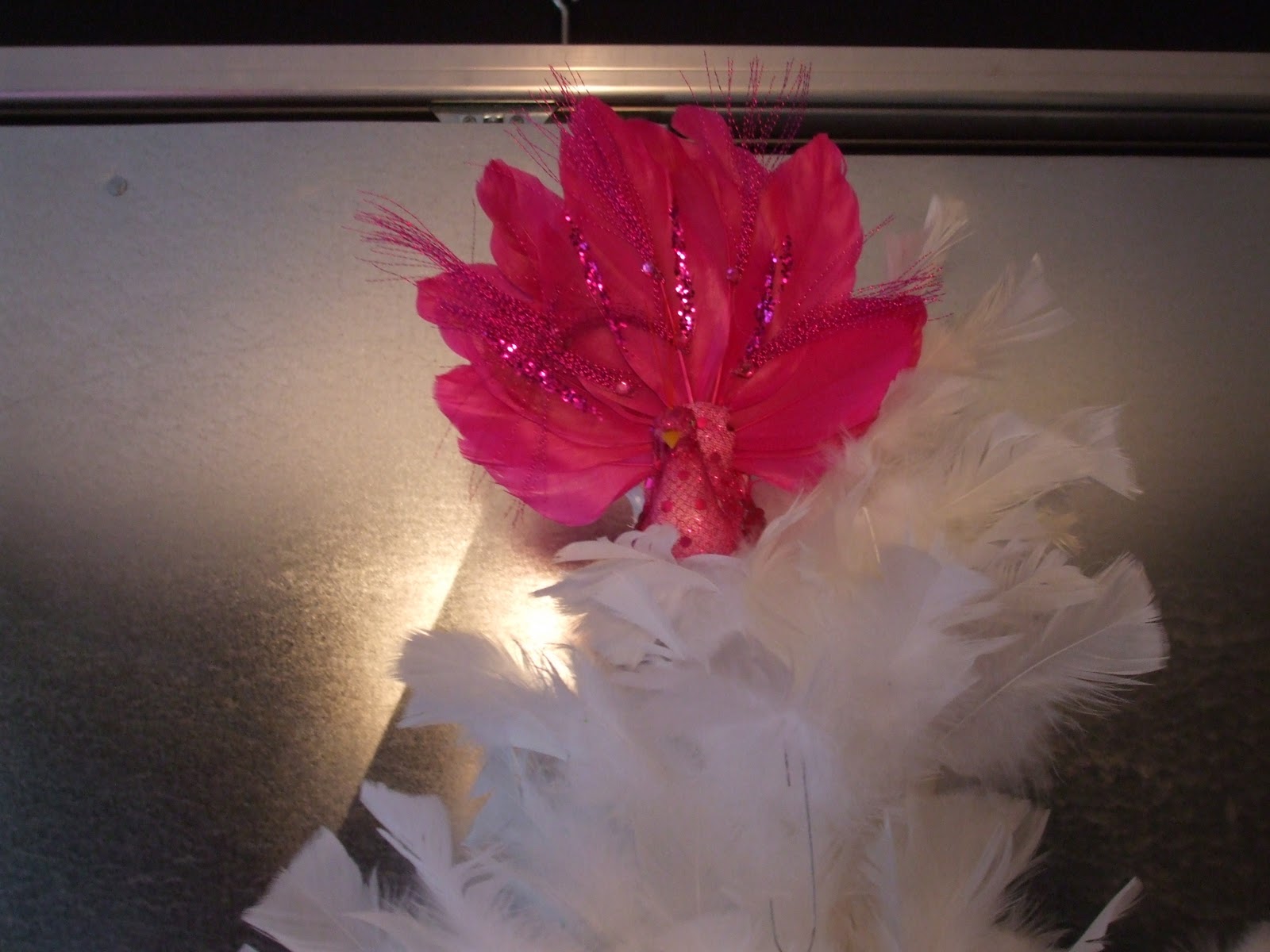 This year, I added sparkly turquoise birds with feathers to help tie the flowers in with the overall color scheme. (These were part of the tree decorations two years ago.)