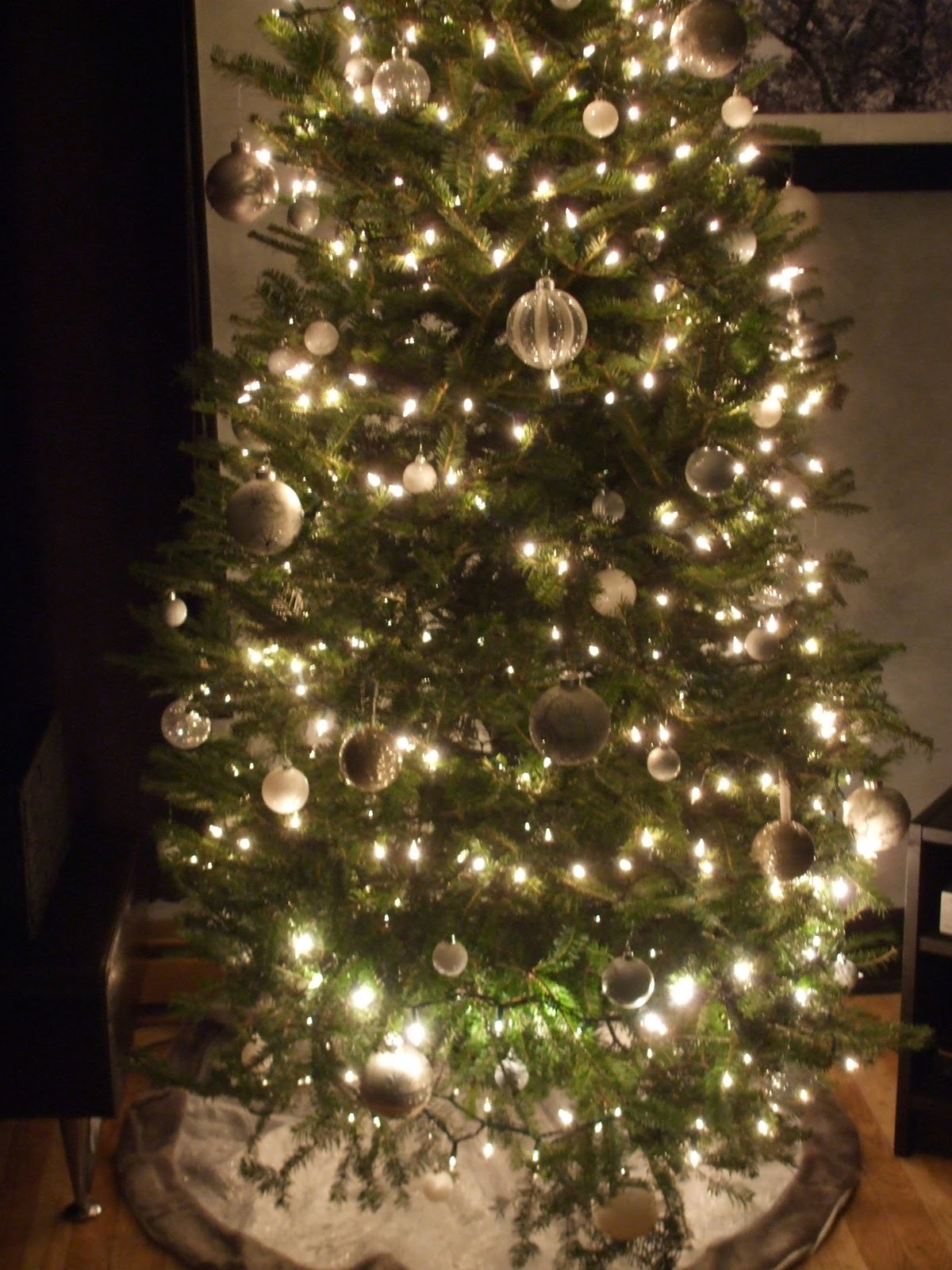 The tree is pulled together with a white and silvery tree skirt – rimmed with light grey fluffy faux fur! So awesome.