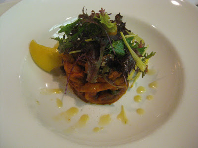 dolce to end the meal. The plate had a trio of small portions of those available on the dessert menu. There was strawberry shortcake; buttery cake with fresh succulent berries and a sweet, yet light cream. The lemon meringue cheesecake was surprisingly light, with a subtle lemon flavor complimented by the tart cream cheese. To top it off, a chewy meringue. torched on top to allow or that slightly caramelized flavor I love so much about this dish. Next, came the chocolate macaroon, an exotic coconut treat with a slightly chewy texture, topped by a tantalizing blueberry sauce and grilled bananas.