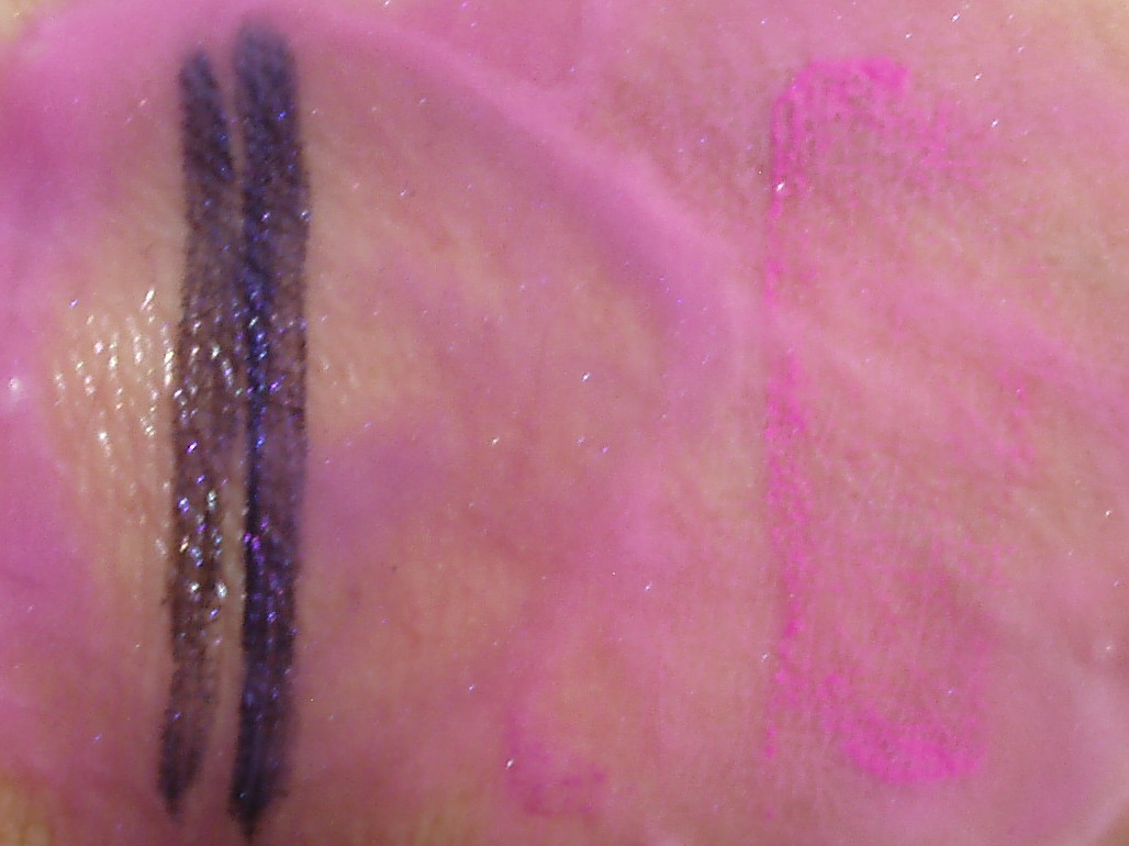 A little illustration of how the balm works its magic. These are swatches of a liquid liner, a lipstick and a long wearing liquid lipstick, with the balm being massaged on for a few seconds.