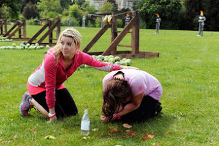 Talk about “right in the kisser!” I don’t know what’s worse – the frequency with which Brook speaks, or the fact that Claire did not appear to receive medical attention from anyone who was not dressed as a court jester. If I had a watermelon smash on my face, I’d want to see a doctor. Kudos to Claire though, because she knocked that sucker down on her second try after The Incident. The Glee boys surpassed them for third place, but they came in a respectable fourth place, followed by the Volleyball girls in fifth.