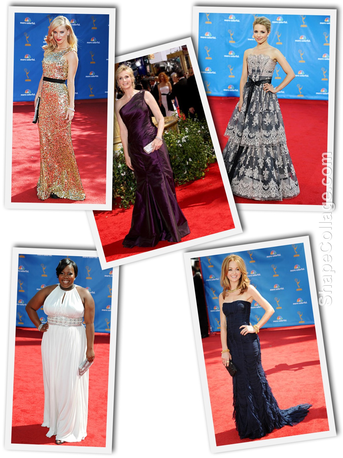 How fantastic do these people look? SO fantastic! Every one of them wins a “Best Dressed” award from me. Let’s start with Heather Morris. Holy Hollywood glamor! Absolutely. Stunning. It would impress even the most critical gay shark. Jane Lynch also looks fabulous. As L-A over at Fashionable People, Questionable things pointed out, the dweebs who work the red carpet (I should totally have that gig) always seemed surprised to see Jane in a gown. Either they have trouble separating fiction from reality and expect her to show up in an Adidas track suit, or they think that all lesbians dress like Ellen Degeneres. Either way, they’re way off – Jane Lynch often rocks the red carpet. I also thought Dianna Agron, one of the most breathtakingly beautiful people on TV, looked stunning. I didn’t love the tiered skirt, but I’m a fan of the overall look. Amber Riley gave Kim Kardashian a run for her money in her white gown. It was super-flattering and might be one of her best fashion choices yet. Finally, Miss Emma Pillsbury herself, Jayma Mays. I think the deep blue hue of the gown looks beautiful in contrast to her red hair, and the fit of the dress was perfect. (Note to January Jones: This is how you leave your hair down.)
