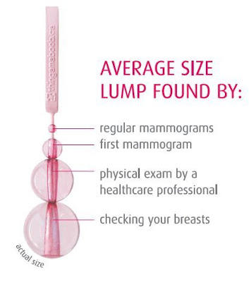 I was absolutely shocked when I took a look at the Thingamaboob and realized the size of lump that can be detected during a mammogram vs. a self exam or physician’s exam. Check out the pic below – the smallest bead is the size of an apple seed {the average sized lump found in a mammogram} and the largest bead is the size of a cherry tomato {the average sized lump found during a self exam}