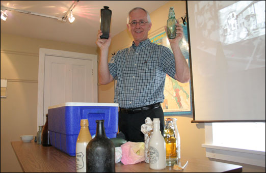 Besides medicine bottles, during is talk on Tuesday Chaulk showed some other fascinating artifacts he has retrieved from Halifax Harbour. Among them were two glass blown bottles from the late 1700s. One of them was a gin bottle from Holland, the country that invented the liquor.