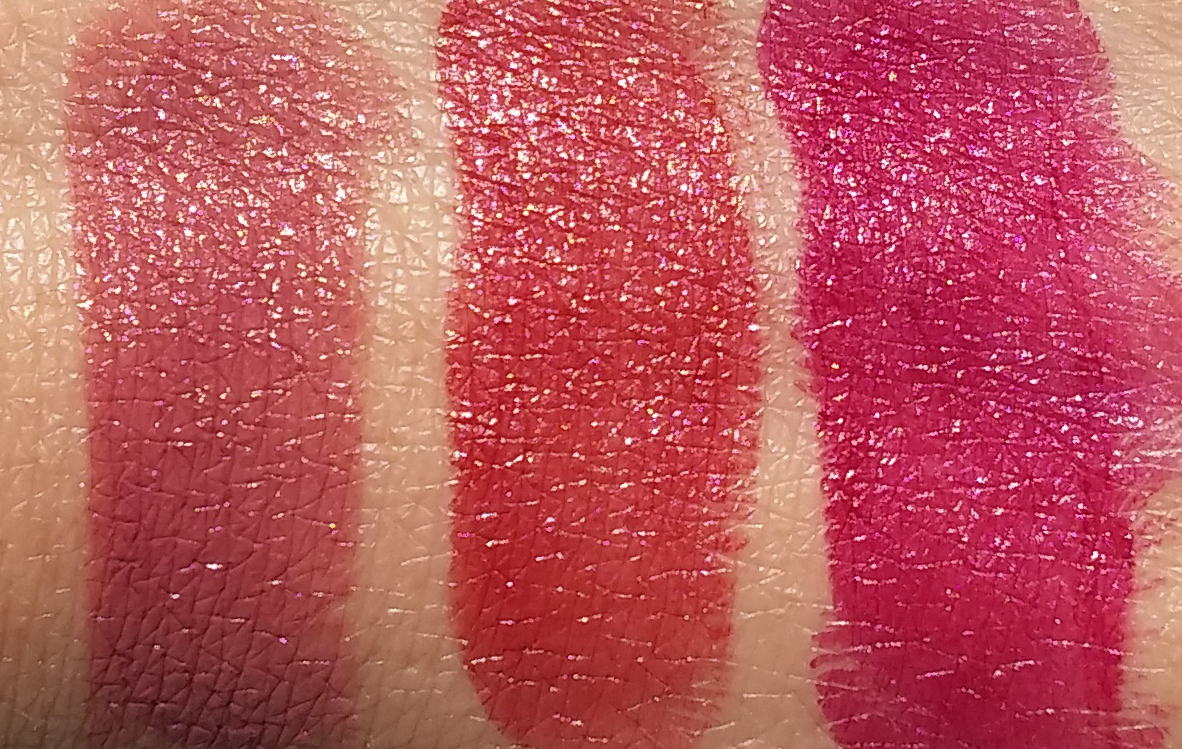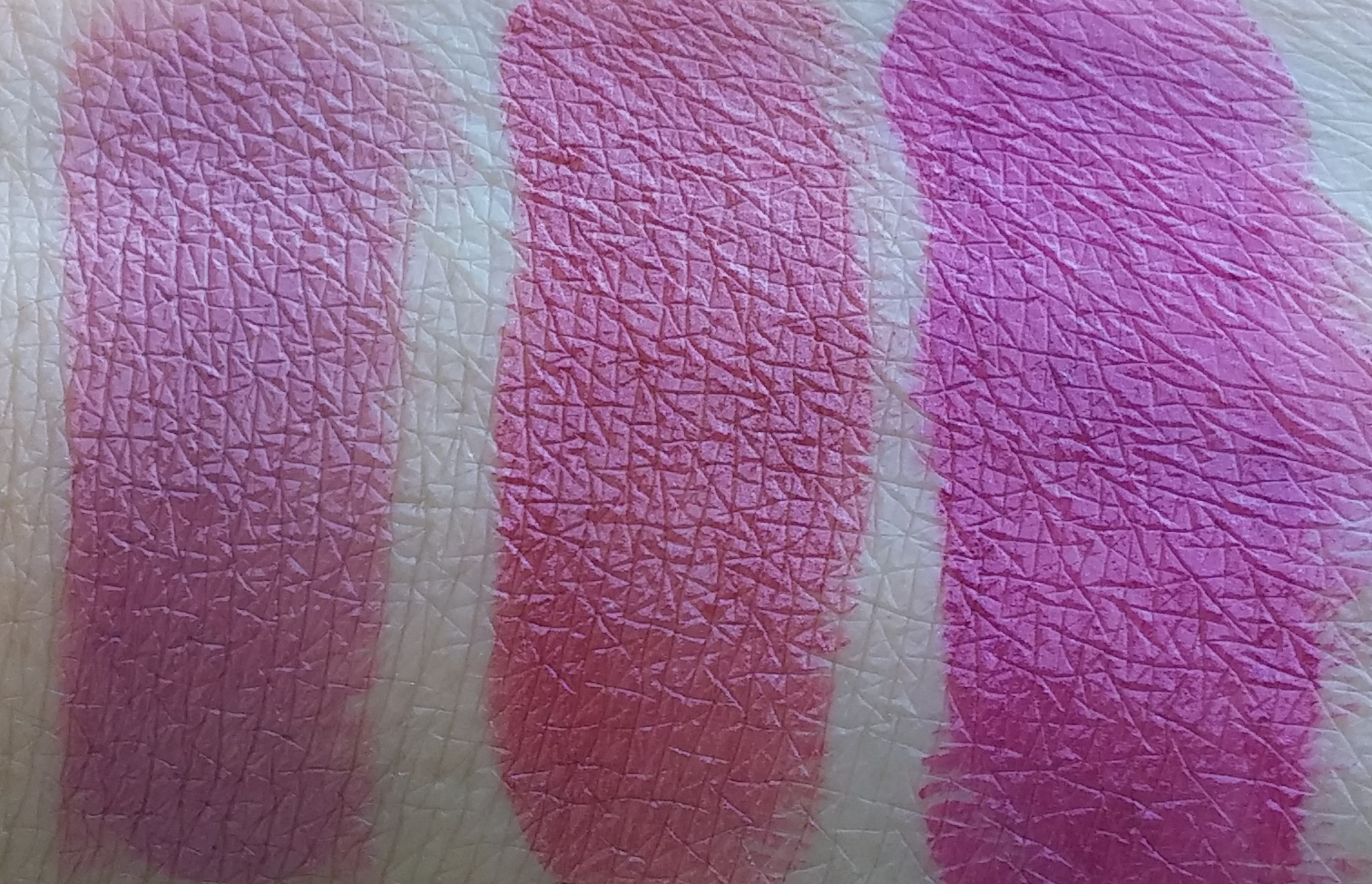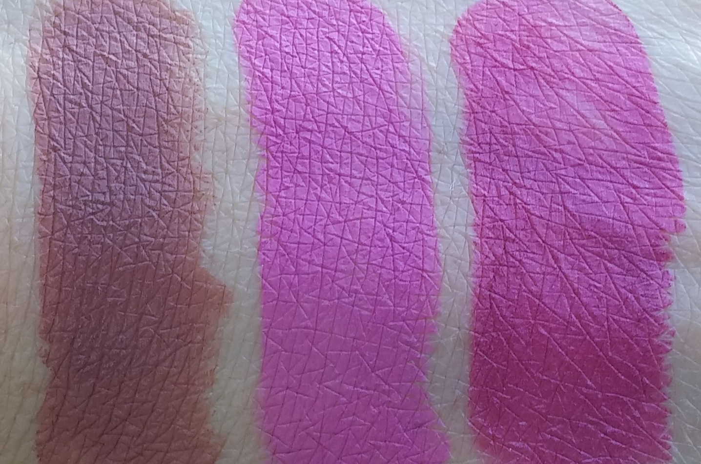 Swatches of 1993 (a matte medium brown), Bittersweet (a matte bright purple) and After Dark (a matte medium-dark berry pink).